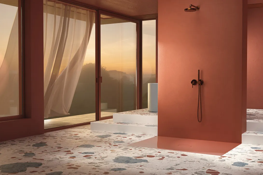 Beige, Sand, Terrakotta und sanfte Brauntöne strahlen Ruhe aus und fördern die Entspannung im Badezimmer. Diese Farbtöne können beispielsweise sehr gut in die Wand- und Bodengestaltung integriert werden.