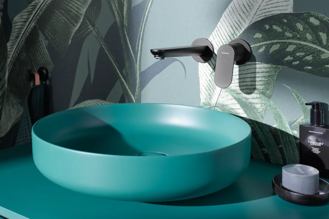 Gold, Korallenrot oder Mintgrün als Eyecatcher in Accessoires, Armaturen oder Fliesen setzt lebendige Akzente und verleiht dem Bad eine dynamische Note.