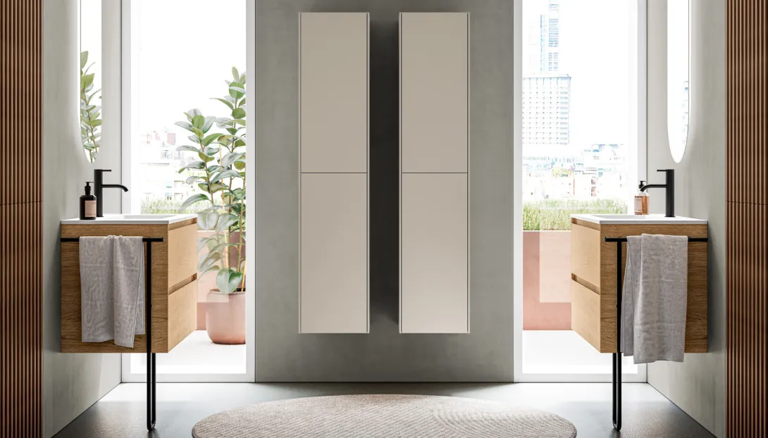 Ein schlankes Seitenprofil zeichnet eine feine Kontur entlang des Schranks und verleiht der Kollektion ihre unverwechselbare Signatur. In Kombination mit hohen Waschtischen oder Waschtischplatten aus Keramik, Ceramilux oder Mineralmarmo entsteht ein stimmiges Gesamtbild mit hohem funktionalem Anspruch.